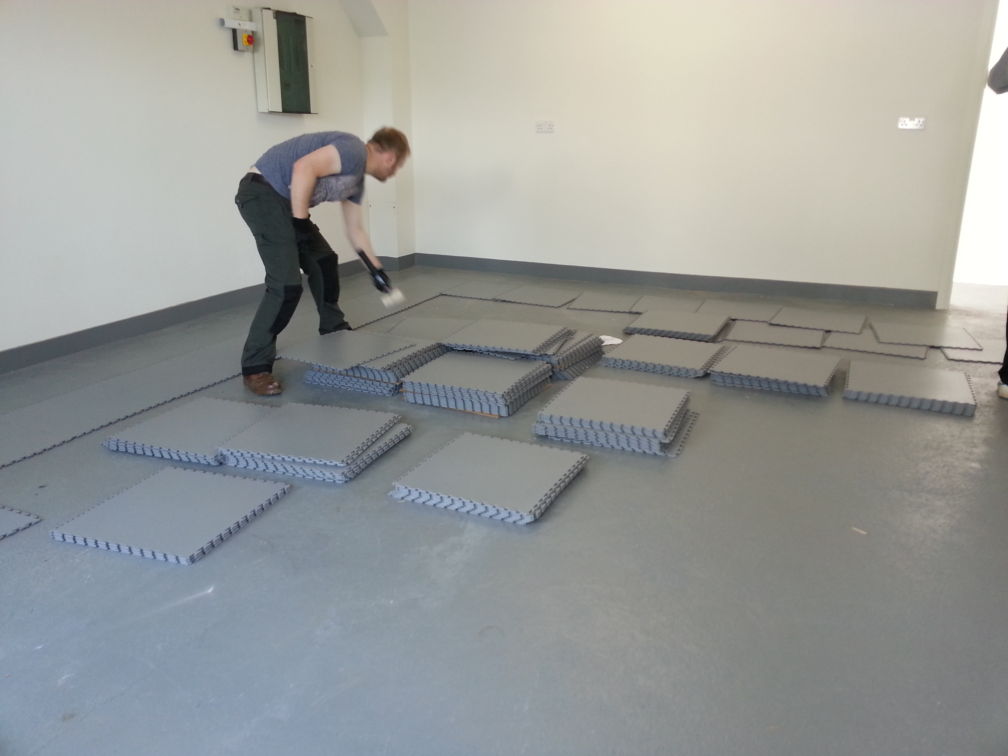 Kick-off the real work by first organising a dry run of the layout. This involves placing the tiles on the floor without engaging the interlocking mechanism, giving you a visual preview of the final outcome. It is extremely important that the tiles are kept square during the installation process. Every room has a different starting point, but If you can, identify a straight wall or edge to work from and snap a straight chalk or laser line about 1-1.5m away from the wall. Having mapped out the desired arrangement, it's time to start interlocking the tiles. Use your reliable rubber mallet to lock the tiles securely in position. Corners or edges may necessitate specific adjustments. In such cases, make sure to accurately measure the available space and use your utility knife to cut the tiles to the appropriate size. This step is crucial to ensure a snug fit and a neat finish, with no awkward spaces or protrusions. Remember, the process requires patience and precision, but the reward will be a sturdy, attractive garage floor that elevates the overall appearance of your space.