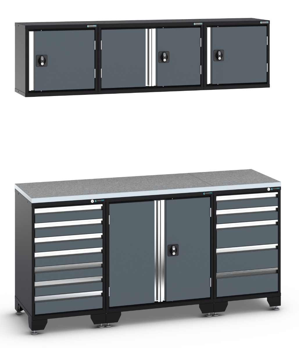 Dimensions: 1850 W x 2100 H x 550 D (mm). A useful and compact worktop and storage solution ideal for the back wall of a single garage.