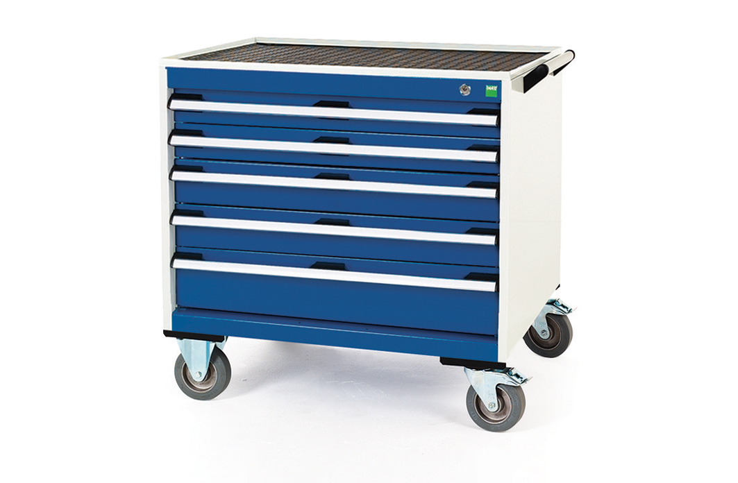 The standard worktops are 40mm thick, of great quality and very durable. There is the option of lino clad with a grey PVC edge banding, or multi-layer wood. The former is probably the preferred option should you be seeking the best appearance and performance. A top tray and rubber mat are also available as an option that might be used on mobile cabinets to retain tools and protect the top surface of the cabinet.