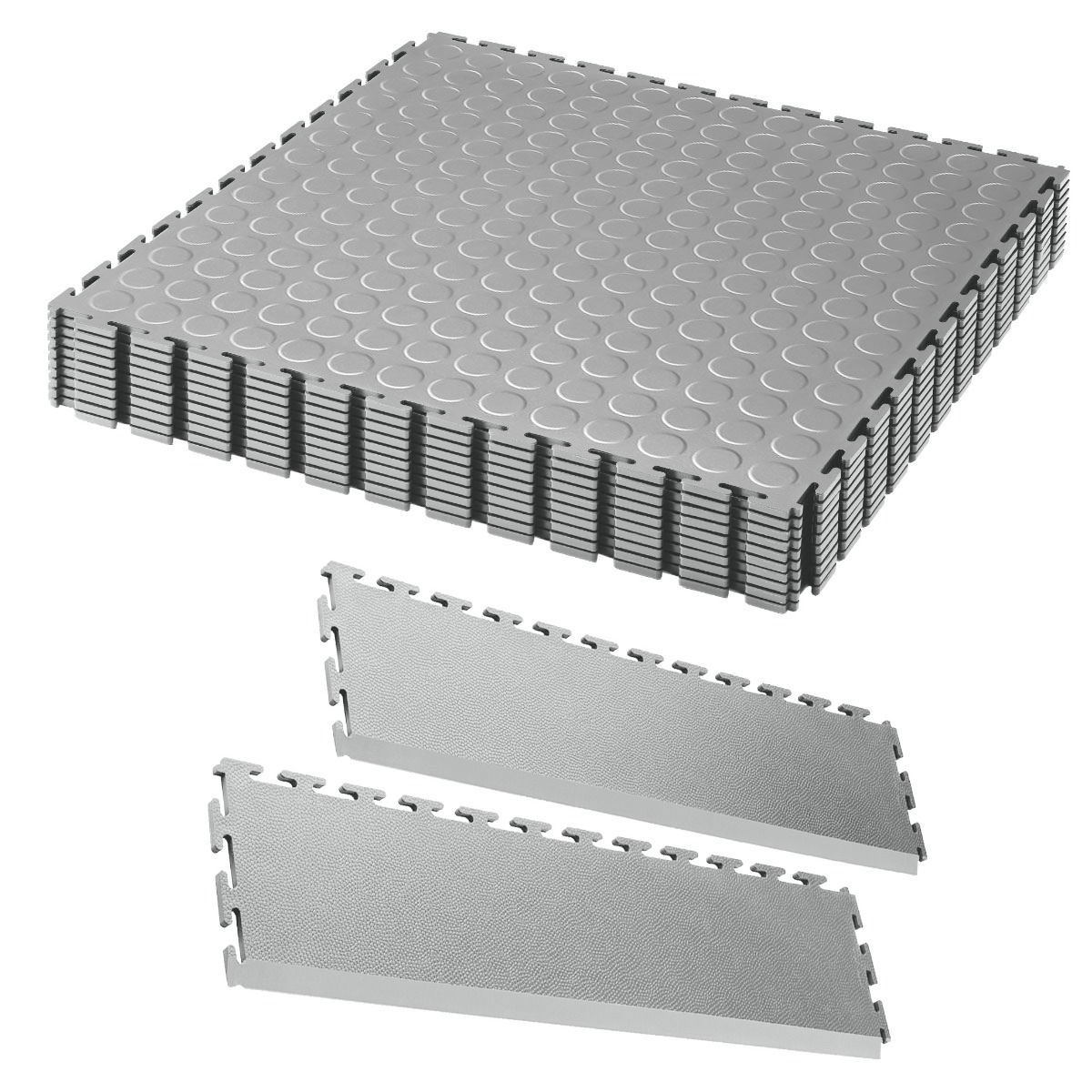 EvoTile professional Raised Disk garage tile in dark grey 36 square meters with 12 ramps kit.