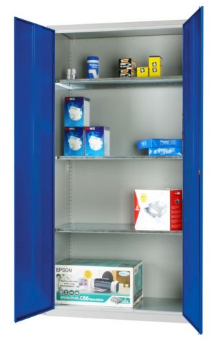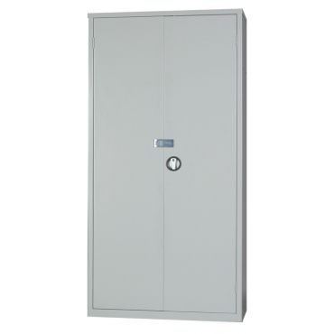 A standard and very economically priced steel cupboard. Three galvanised steel shelves, plus floor and a lockable door. 1830mm x 915mm x 457mm steel shelving cabinet.