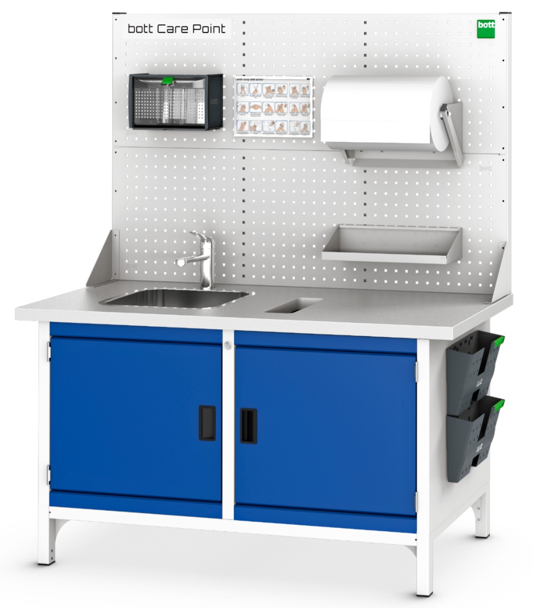 1500x670x840mm worktop height. Complete with basin and hot/cold water, fresh water and waste water connections and waste chute/container, rear perfo panel with paper towel holder, employee information pocket, storage shelf, tilt box and 2 document holders. Worktop is light grey HPL laminate. Finished in light grey with a choice of door colours.