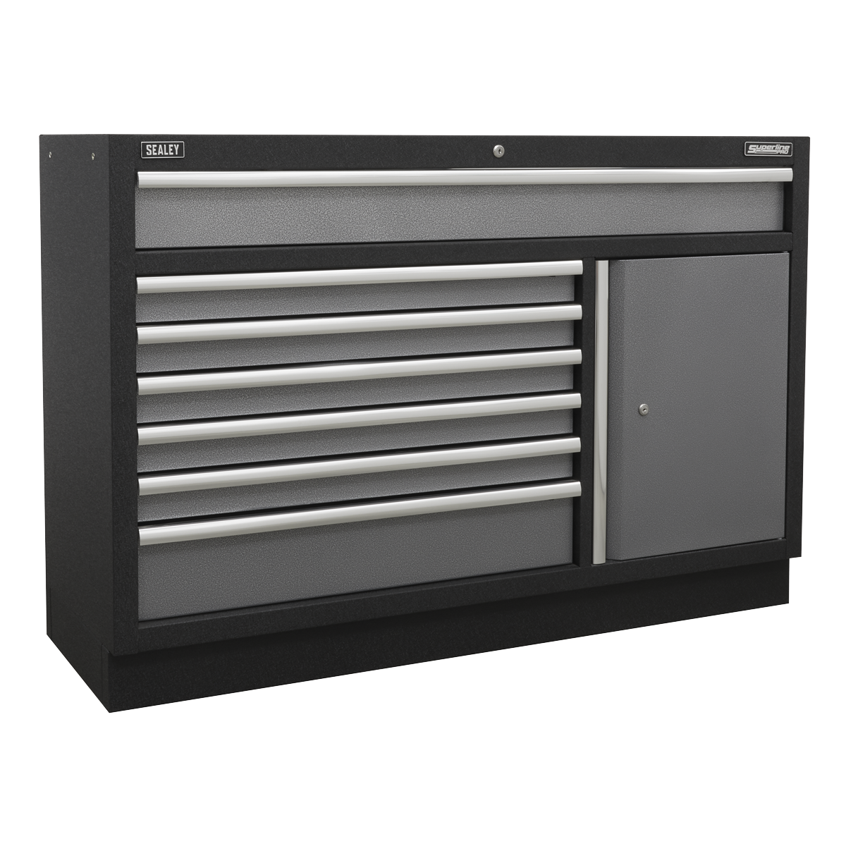 Seven drawers fitted with ball bearing slides. Aluminium drawer pulls. Single cupboard. High quality lock with two keys. WORKTOP REQUIRED.