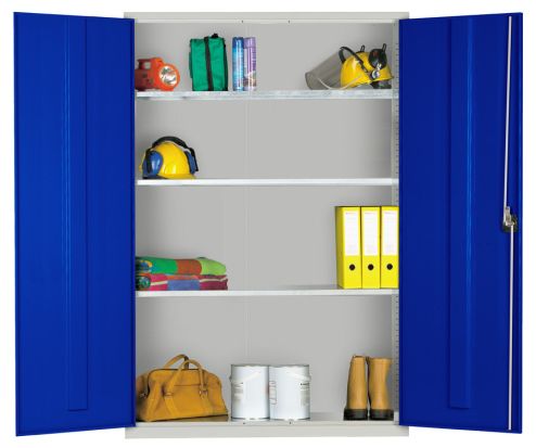 An extra wide, economically priced steel shelving cabinet. Three galvanised steel shelves, plus floor and a lockable door